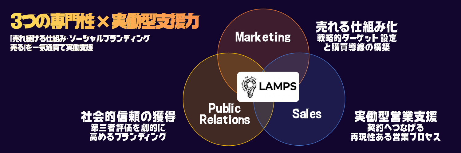 LAMPS独自の価値”3つの専門性 × 実働型支援”で、「売れ続ける仕組み・ソーシャルブランディング・売る」を一気通貫で実働支援します。